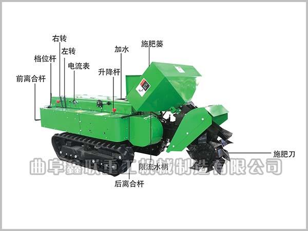 遥控履带式田园管理机机设计新颖,造型奇特、美观,操作简单方便,其使用的可靠性和对低矮果园作业的适应性,深受众多园艺专家的肯定和广大果农的喜爱。其特点为:①、体积小,整体低矮是其大特点。正是由于这一特低优势才能在果树下及大棚内顺利的进行各种作业。②、使用范围广,方便配套不同的农机具,可完成旋耕、开沟、除草、施肥及喷洒农药等作业。③、采用履带行走机构,改善了拖拉机的附着性能,减少了接地压力和滑移,并能原地360.调头转弯,能在低矮果树下完成各种作业,作业运转平稳,行走笔直,几乎无需操作就能在树下轻松顺畅的完成多种作业,通过性好,尤其对各种小梁、小沟、陡坡,顺畅通过,不碾地、不打滑、牵引力大,挂超低拖车,在果园内运果省力省时,节约大量人力。④、操作简单,有三个前进档,一个后退档。能轻松自如操纵使用。⑤、投资少,回报快,一个作业季就可收回成本。⑥、不误农时,解决了果农雇工难、支出多,降低了果农的生产成本。